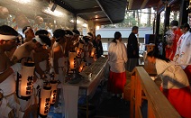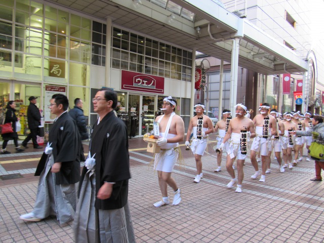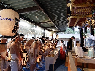 また、この「御神火」を目指して参拝する「裸参り」があります。これは厳寒時に仕込み入る酒杜氏が醸造安全・吟醸祈願のために参拝したのが始まりとされ、江戸時代中期には既に定着していたようです。現在においても、白鉢巻・白さらしを巻き、口には私語を慎む為に「含み紙」をくわえ、右手には鐘・左手には提灯を持ち、市内各所より数千人が参拝するさまは、杜の都・仙台の冬の風物詩として全国に知られています。